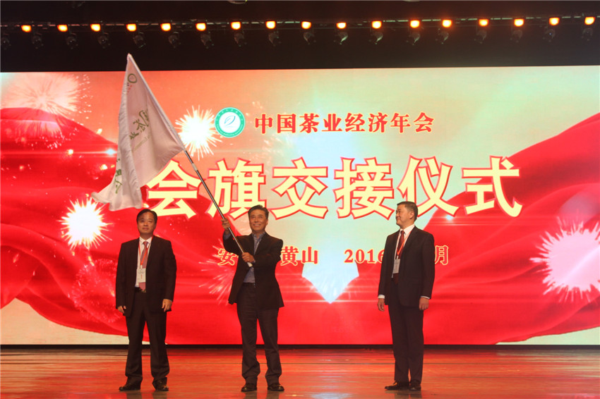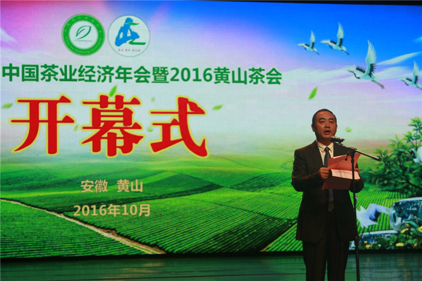 开幕式由黄山市委副书记、市长孔晓宏主持,中华全国供销合作总社党组成员、理事会副主任肖仲凯,安徽省农委主任孙正东,黄山市委书记任泽锋分别致辞。各位领导对本届年会的成功召开表示祝贺,对中国茶叶经济取得的成就给予高度评价,对黄山茶产业、安徽茶产业以及中国茶产业的发展给予厚望,并鼓励与会的茶叶界同仁在党和政府的正确指引下,团结一致、锐意进取、深化改革、真抓实干、开拓创新、继往开来,为重振中国茶产业的辉煌而努力奋斗。随后,第十届、十一届全国政协副主席白立忱宣布第十二届中国茶业经济年会正式开幕。开幕式上,中国茶叶流通协会对2016年度中国茶业十大领军企业、中国茶业优秀企业品牌、中国茶业十佳成长型企业及中国十大生态产茶县、中国最美茶乡和行业年度人物、茶业发展示范县进行了行业表彰。白立忱副主席代表中国茶叶流通协会向黄山市政府授予“中国名茶之都”牌匾。