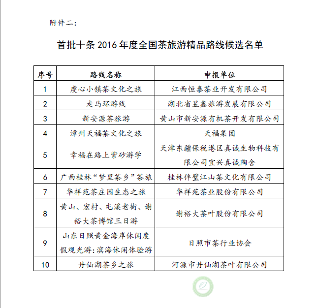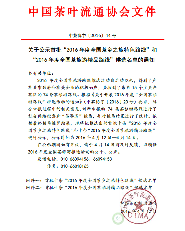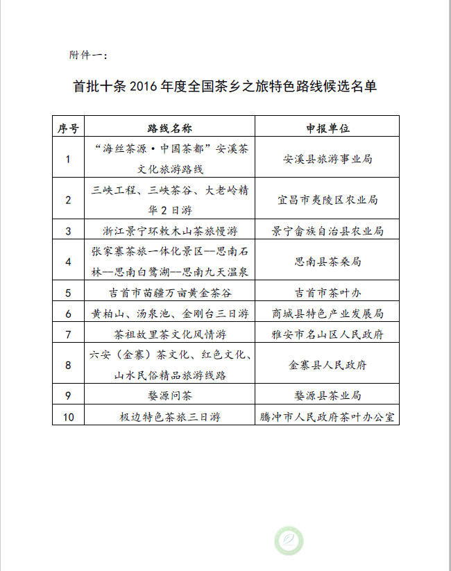 关于公示首批“2016年度全国茶乡之旅特色路线”