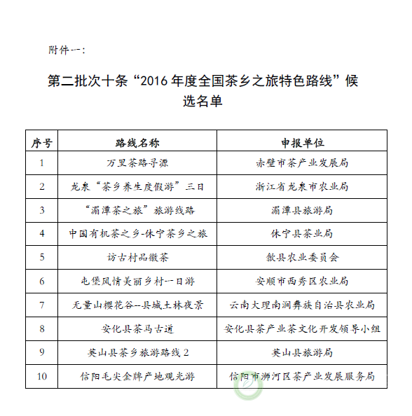 关于公示第二批次“2016年度全国茶乡之旅特色路
