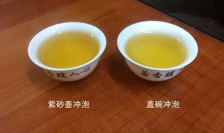 图片是我用紫砂和盖碗黄枝香泡出的,茶器容量一样,茶叶克数一样,浸泡时间一样。两杯放在一起看就可以看出明显的区别,紫砂壶泡出的茶汤颜色略深,说明比盖碗泡出的味道偏浓些。