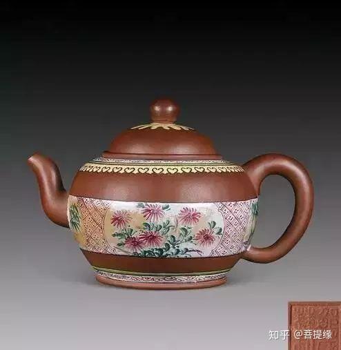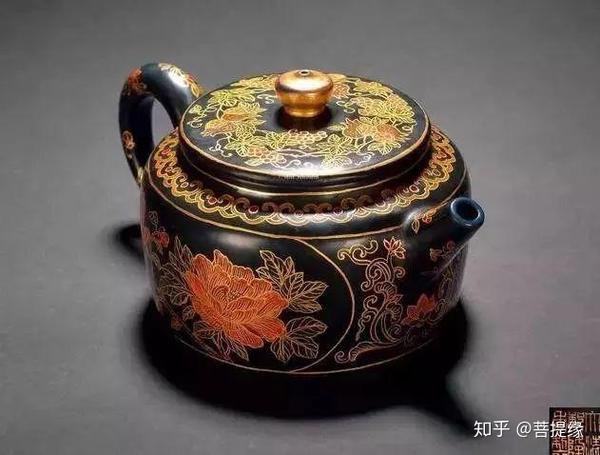 清乾隆 紫砂描金万寿如意吉庆有余纹茶壶
