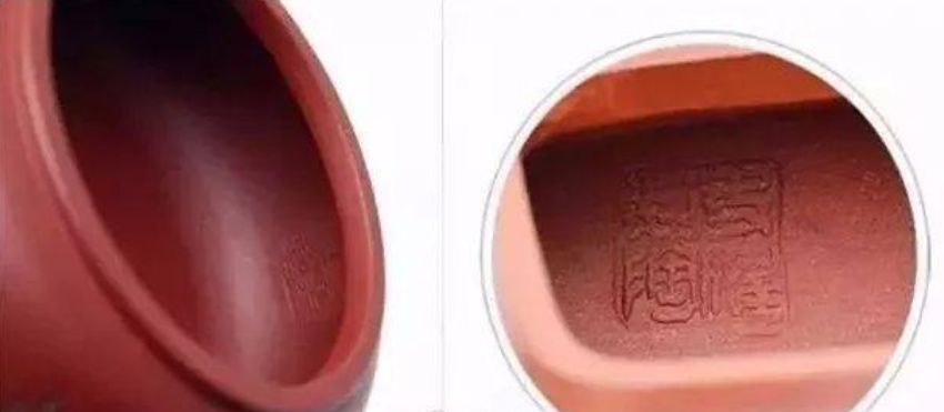 全手工制作的壶,打好泥片后,印章在围身筒前就敲打在泥片上,待身筒拍好后,印章就留在壶的内壁。也有的陶手在身筒的粘合线上加盖自己的印章。