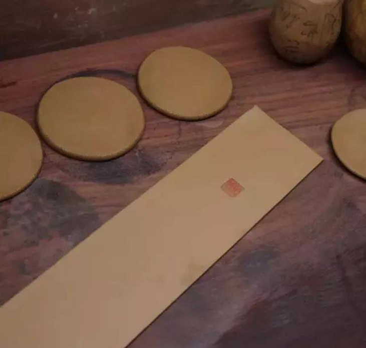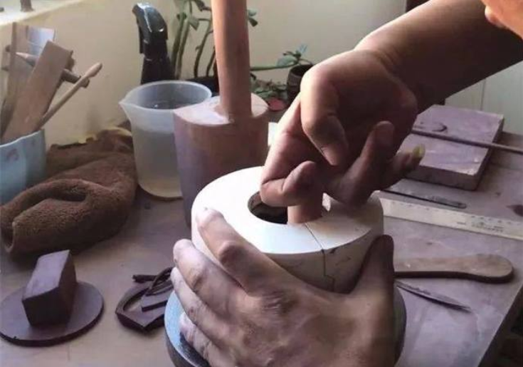 而半手工的壶,要借助模具来起形,需要搪身筒。如果泥片上有印,会被搪得模糊不清。半手工壶的印章是在壶坯成型后才能盖,而全手工壶在泥条状态下盖好后,再制成壶。
