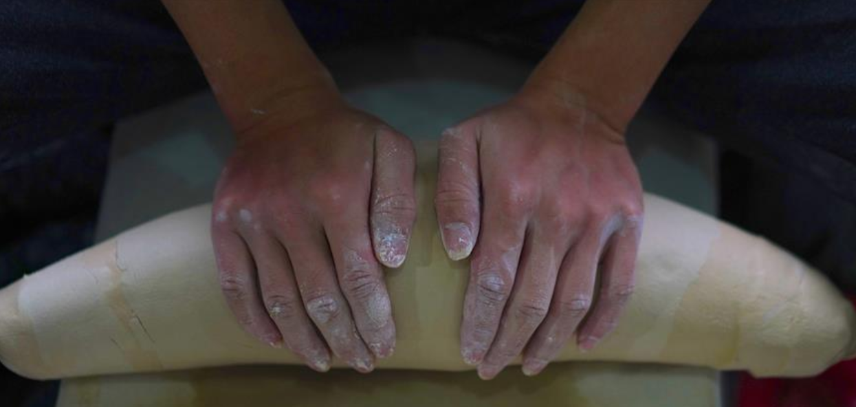 10月19日,团队成员江新腾在进行揉泥工序。