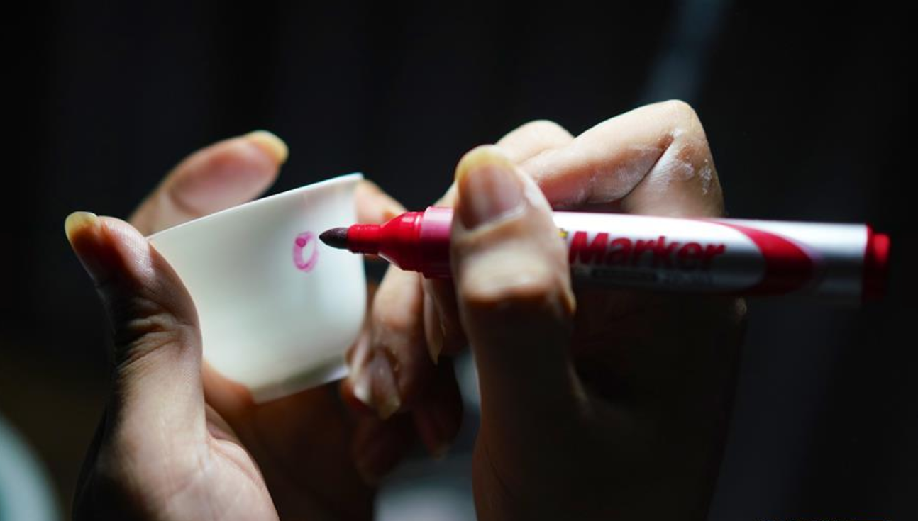10月19日,团队成员汪敏辉在检查最新烧制出的瓷杯,并将不合格的产品画上记号以便复烧。