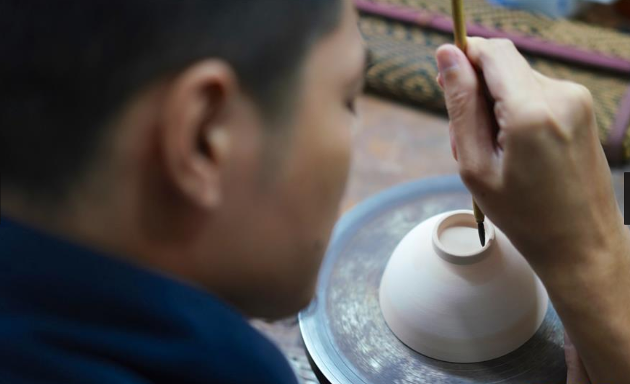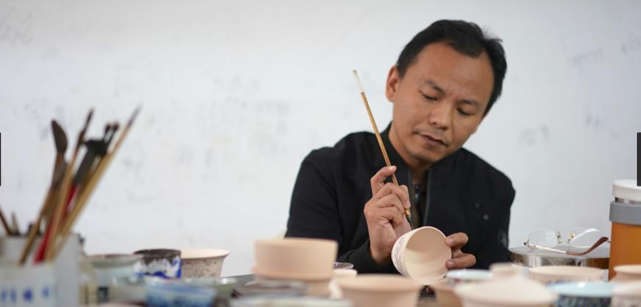 10月19日,团队成员刘震在陶瓷上绘画。