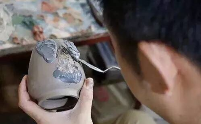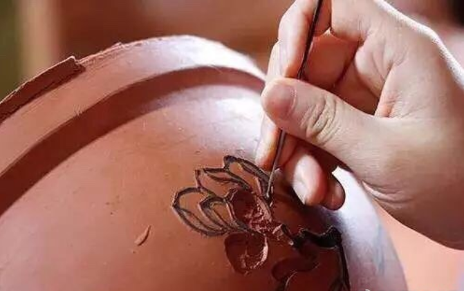 建水紫陶为雕刻填泥装饰,生胚时雕刻纹饰,再填入白泥或者各种色泥,形成色彩对比。