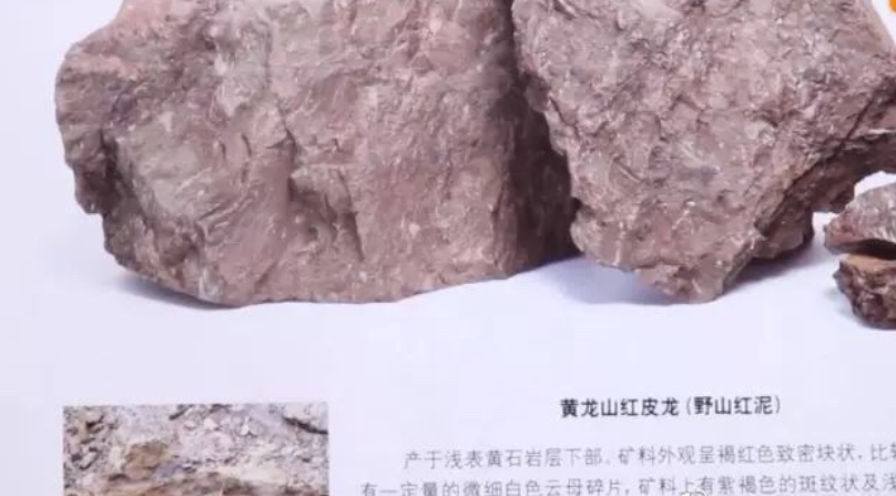 红皮龙产自黄龙山,矿料外观呈褐红色致密块状,比较坚硬,表面有锈色状。部分矿料上有浅黄、灰白色的斑纹状。