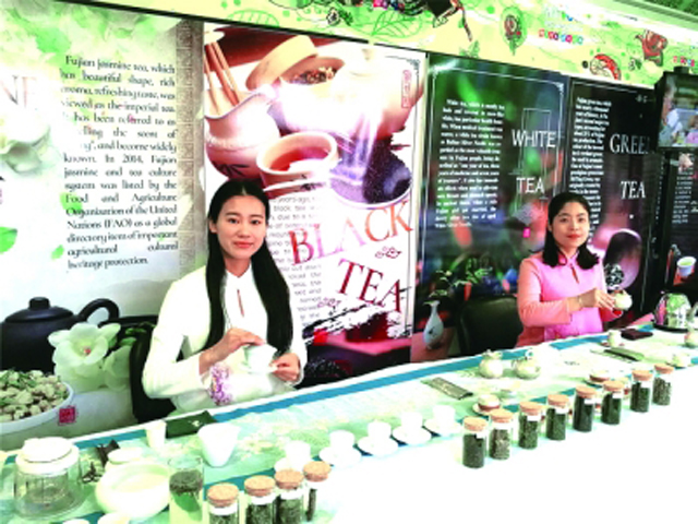 在福建茶文化主题展中,茶艺展示以古筝轻音乐为背景,茶艺师现场进行乌龙茶、白茶、花茶等的茶艺展示,表演者所泡茗茶吸引现场观众踊跃品鉴,与茶叶、茶具、服装等专门茶道用具及用法亲密接触,领略中国茶文化的魅力。“白茶口感很清淡,令人回味无穷,具有安神作用。我已经爱上它了!”一位外国游客说。另一位游客兴奋地告诉工作人员:“我曾在中国生活过,喜欢中国、喜欢中国茶。”