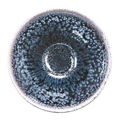 如今,几十年过去了,蔡炳盛不断钻研建盏各类品质的烧制,配出了各种釉水配方,老窑的各种花色烧制技术已全部复现。尤其是他制作的银蓝油滴盏,泛发着幽蓝的光泽,油滴滴点实而不虚,晶体厚重,古韵十足,备受人们的欢迎。除了传承宋盏经典款式之外,蔡炳盛还创新釉料,开发出类似耀斑形状的铁红色斑纹作品“火凤凰”。“‘火凤凰’需要做到对温度的精确把控,多一度釉面会烧黄,少一度则滴不成滴。”