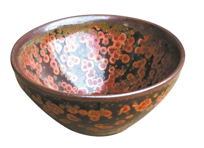 但蔡炳盛并未满足。宋代建窑分兔毫盏、油滴盏、曜变盏以及柿红、灰皮、乌金等杂色釉,珍贵程度由高到低依次为曜变、油滴、兔毫。烧制出了兔毫盏,雄心勃勃的蔡炳盛又向着油滴盏进发了。这一目标的达成,更非试烧兔毫盏可比拟——直到八年后的1990年,经过不懈的努力,通过对坯、釉原料的收缩比例、施釉的厚薄程度、烧窑时一氧化碳的浓淡和烧成温度等的严格分析和把控,蔡炳盛终于成功烧制出油滴盏。“兔毫釉是在氧化气氛中实现的,而油滴盏需要还原气氛,成败在于最后烧炉的几分钟,因此难度非常高。”