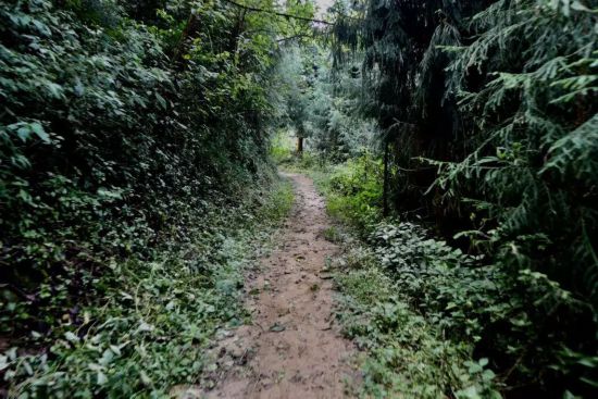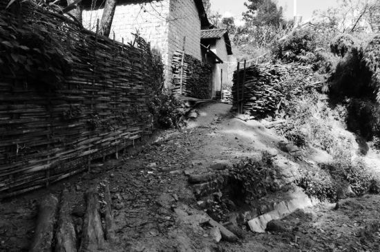 村寨路段,坡势不急,路面潮湿暗淡,散发着泥土的清气。尽管湿度很大,走起来却没有拖泥带水的意思。每隔几步路,路边上就有竹片编织的栅栏将路与屋舍隔开,严实地保护着菜园和农家领地。