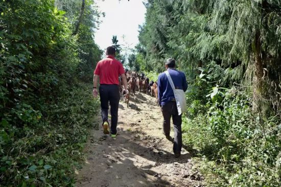 这里遇见一位老农,身披毡子,腰挂砍刀,悠闲地赶着三四十只肥硕的山羊走在我们前面。我追上去,用云南方言搭话,问他去哪里放羊、家中有没有茶树云云问题,然而他答我的我不太懂,却一直兴致勃勃,直到在某个路口分开。