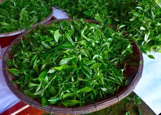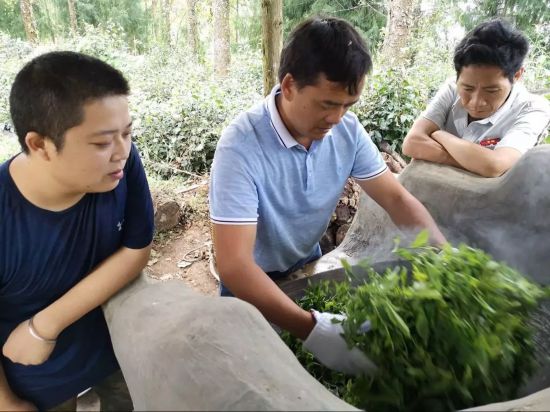 颇为遗憾的是,由于已过采摘时令,这些鲜叶都是十多年的小树茶,未能按原计划用当地古树茶原料作示范。又因没有炒茶用的手套,传授炒茶事宜暂时被耽搁下来。