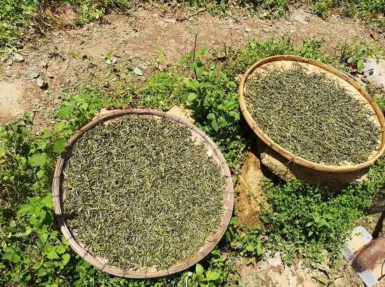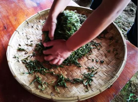 搓揉结束后,老朱捡起几根索条闻一闻说:“香气出来了。”他把茶叶均匀铺散在簸箕中,进入了晒青环节。据老朱讲授,晒青的时间一般不少于1天,在凉晒的过程中,不能随意翻动,除非茶叶已经完全干透,才能轻轻翻动,这也是为了防止索条断碎。
