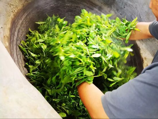待锅干燥以后,他讲道:“锅的温度起码要达到300~320度,茶叶才能下锅,如果低于200度,大部分茶叶就会被拖坏。”他随即将一旁的簸箕端起,顺手将茶叶全部倒入锅中,锅底顿时发出“吧嗒吧嗒”的响声,伴生一股带青味儿的热气。他即刻放下簸箕,一边徒手在热锅中老练地翻炒起来,一边说:“这些声音是青叶遇热所致,若下锅温度过低,这类声音就会很少,这个可以作为判断炒锅温度和火候的一种经验。”