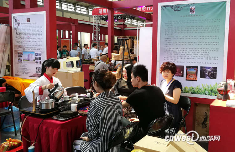 客商在咸阳茯茶展区品茶、洽谈业务。