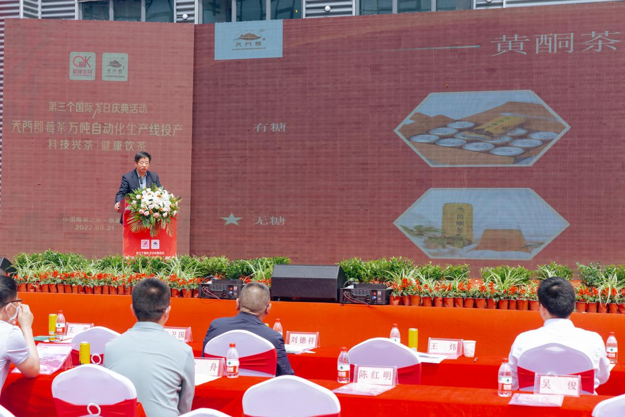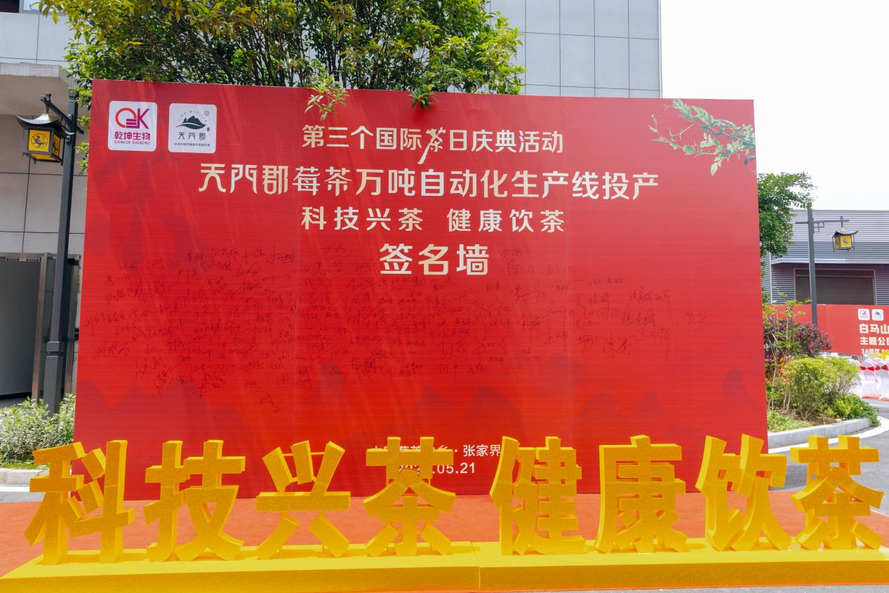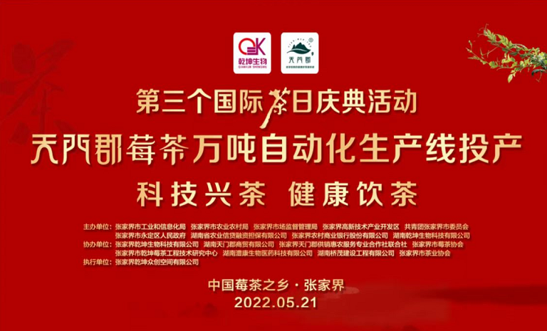 5月21日上午,第三个国际茶日张家界市“科技兴茶、健康饮茶”庆典活动在张家界高新区乾坤生物健康产业园举行,由湖南乾坤生物科技有限公司天门郡莓茶标准化生产车间国内首条连续式自动化生产线正式投产,标志着张家界市“茶旅融合”迈入新征程。湖南省张家界市人民政府副市长万东,长江学者、湖南中医药大学药学院院长王炜,张家界市茶叶协会会长刘德祥,张家界市工业和信息化局党局长姚晓丽,张家界高新技术产业开发区党工委书记侯毅,张家界市场监督管理局引进高端人才博士王涯,共青团张家界市委员会副书记黎涛,张家界市永定区副区长覃事永,张家界农村商业银行行长罗锋杰,湖南省农业信贷融资担保有限公司张家界分公司副总经理张子翱,湖南乾坤生物科技有限公司董事长、天门郡品牌创始人刘超及百余家中央、省、市媒体和网红达人共同见证。