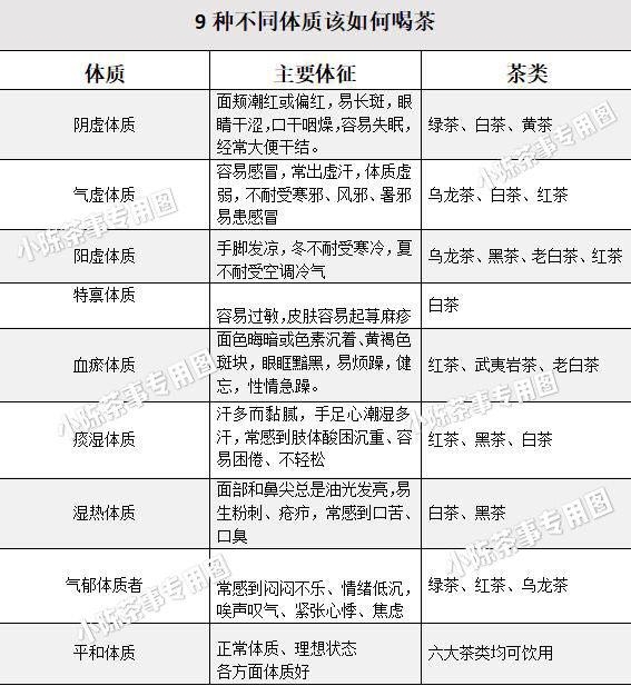 在文章的最后,将不同体质的饮茶选择制作成图片,供列位看官参考。