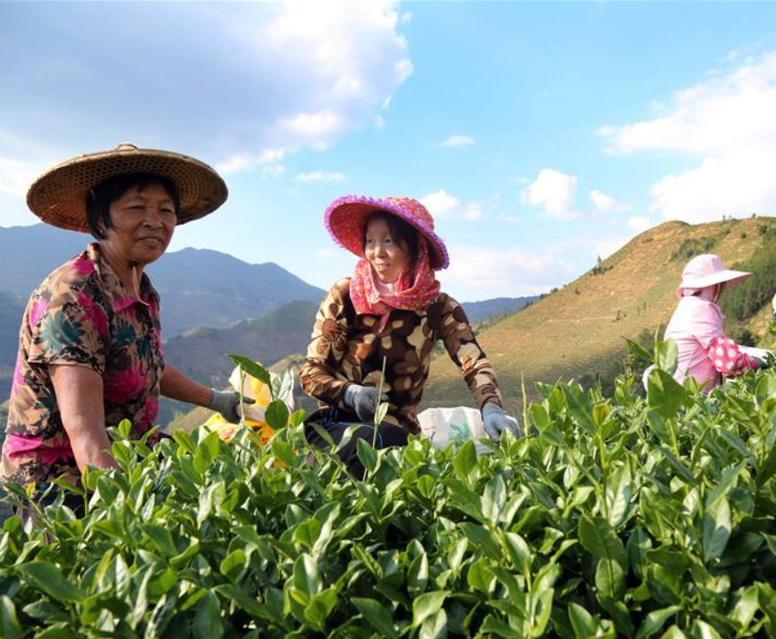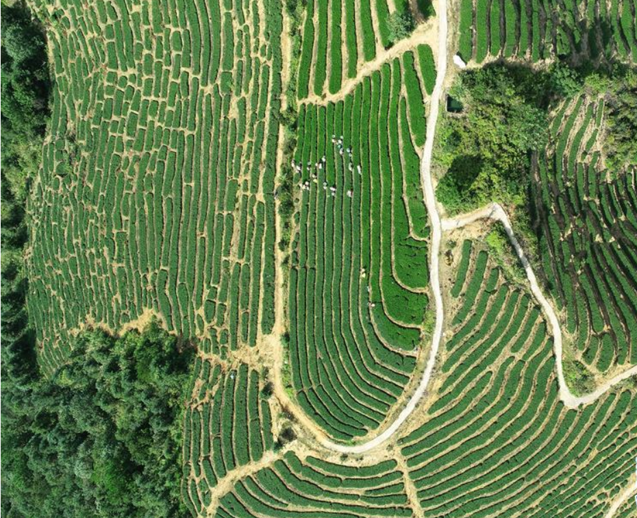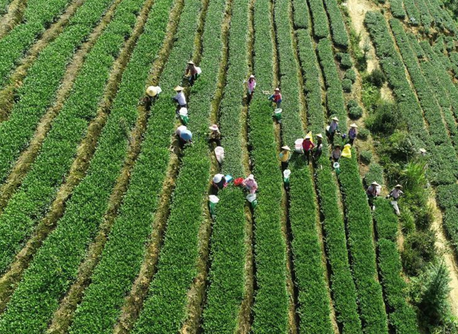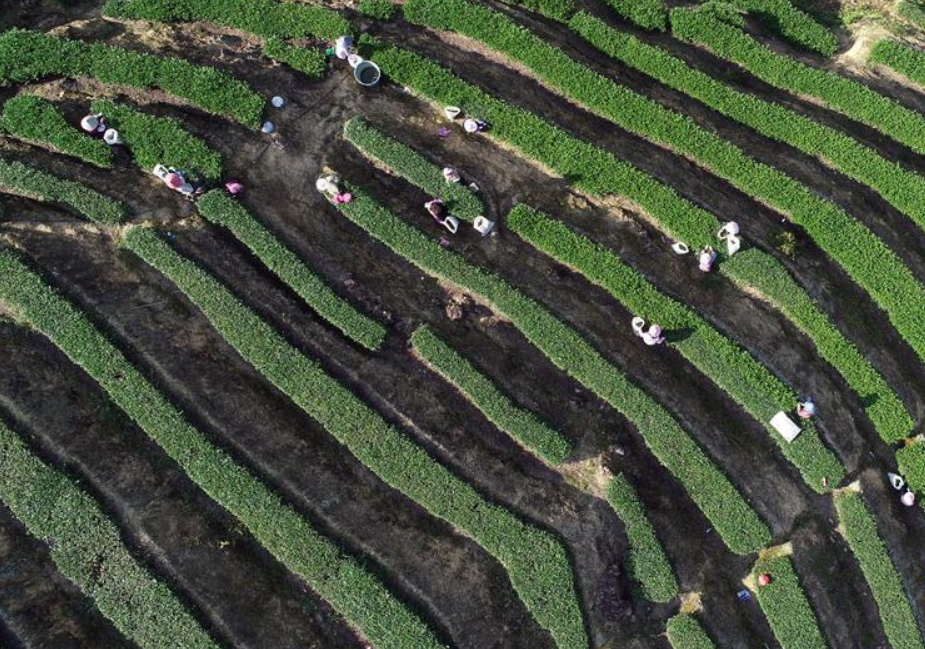 10月6日,茶农在福建省安溪县祥华乡旧寨村采收铁观音秋茶(无人机拍摄)。 寒露节气临近,福建省安溪县迎来铁观音秋茶采摘加工旺季。