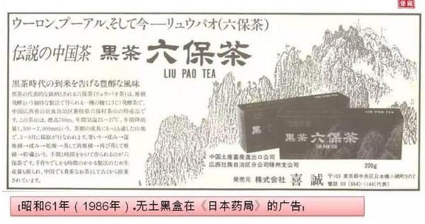 六堡茶在日本也曾作为保健药品,以“健美瘦身茶”、“油解茶”名称在各地药店出售。1991年,日本黑茶协会会长堤定藏先生专程到梧州茶叶进出口公司考察,后经日本药业界检测证实:六堡茶含有丰富的各种营养素,有强力的降脂解腻、减肥健美功效。这一消息传开后,六堡茶曾一度风靡日本东京。